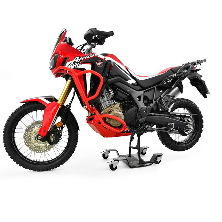 Tento stojan je výbornou pomůckou pro servis a parkování vašeho motocyklu. Můžete moto otočit na místě s maximální lehkostí a manévrovat ve velmi omezeném prostoru. Kvalitní dvojité kolečka zajišťují stabilitu při pohybu a brzda zabraňuje náhodnému odvrácení. Tento centrální stojan je vhodný pro prakticky všechny motocykly se středovým stojanem.