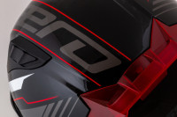 Mechanismus plexi s více polohami nastavení pozice a jazýčkem pro docvaknutí plexi v zavřené pozici.