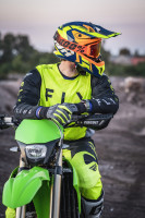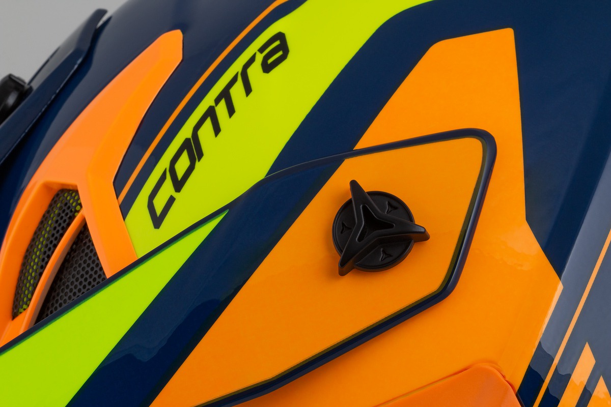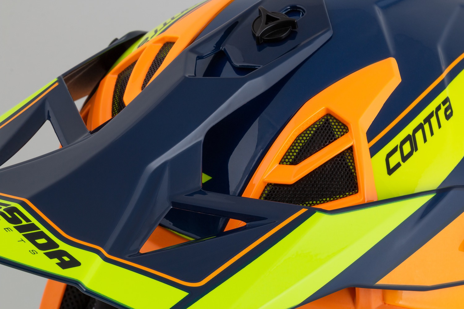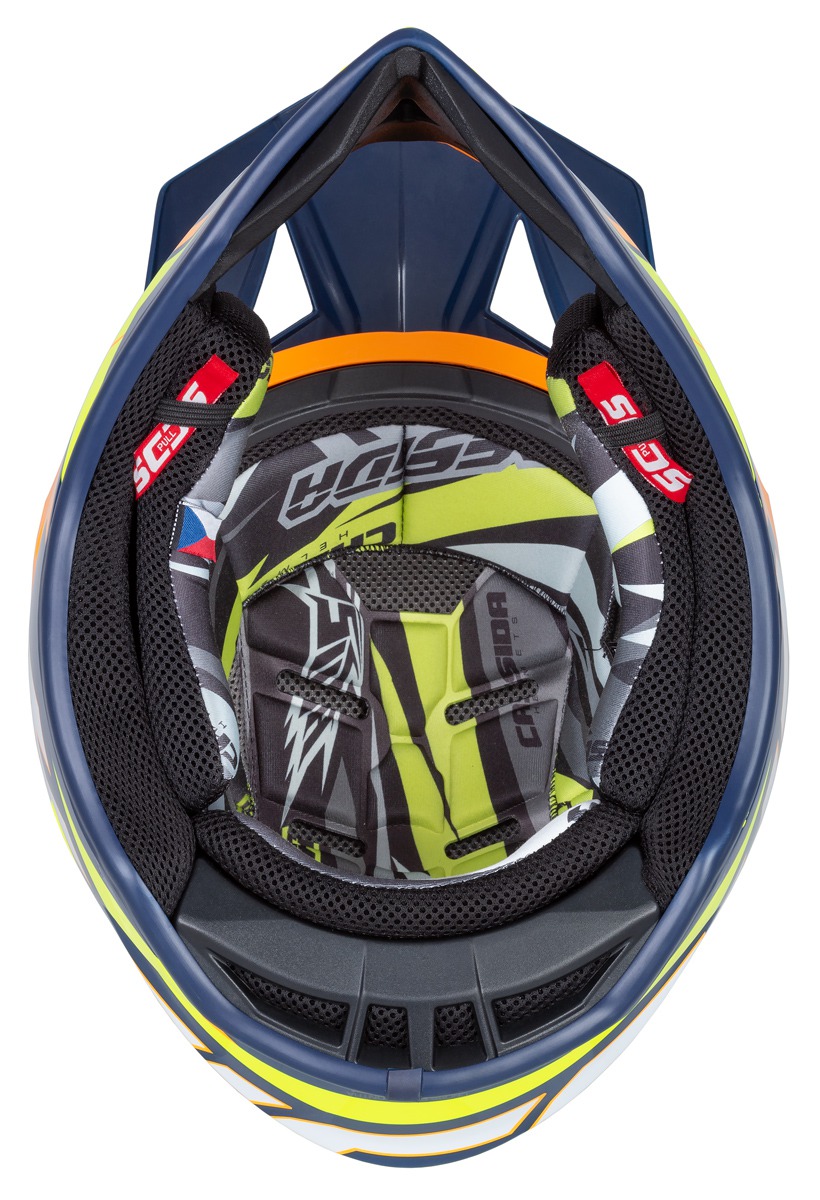 - Spodní část přilby je tvarově přizpůsobena pro fungování s protektory krční páteře.