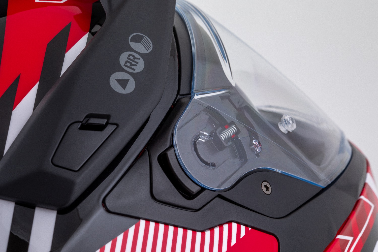 Rychloodepínací mechanismus plexi s více polohami nastavení pozice a jazýčkem pro docvaknutí plexi v zavřené pozici.