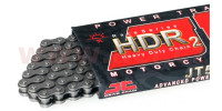 Délka čepu: 17,8 mm Tloušťka plátku vnitřní: 2 mm Tloušťka plátku vnější: 2 mm Maximální pevnost v tahu: 36,3 kN Hmotnost 100 článků: 1,47 kg Spojovací článek: sponka Typ těsnícího kroužku: bezkroužek Max. kubatura road/off road: 200/350 ccm Popis: HDR (Heavy Duty Chain) je primárně motokrosový bezkroužkový řetěz vhodný i pro silniční a adventure motocykly malých kubatur