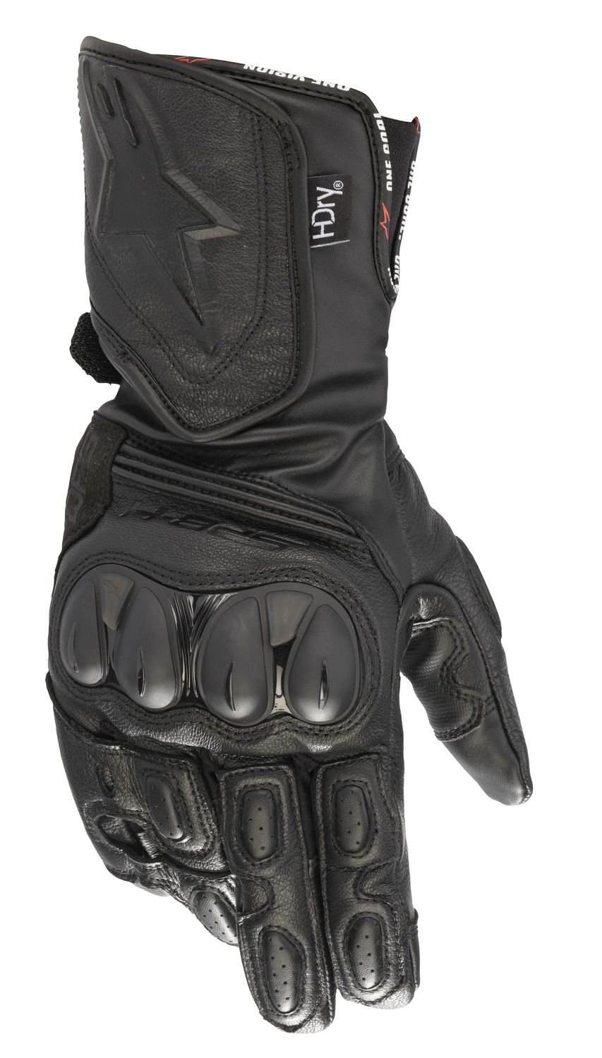 Sportovní rukavice SP-8 HDry® s plně voděodolnou a prodyšnou konstrukcí, obsahující laminovanou klimatickou membránu HDry® nabízejí díky malé tloušťce laminace v oblasti dlaně vysoký cit při kontaktu s gripy řídítek. Základní struktura rukavice je postavena na základě populární dlouhé sportovní rukavice, nesoucí závodní DNA značky ALPINESTARS. Obšívka rukavice je vyrobena z kozí kůže v kombinaci se syntetickým mikrovláknem. Zahrnuje vícepanelové uspořádání s integrovanými protektory pro dosažení vysokého standardu ochrany proti oděru a komfortu současně. Chránič zápěstí tvoří protektor z TPU plastu. Zapínání pomocí zdvojené manžety na suchý zip a strečový můstek mezi palcem a ukazováčkem zajišťují zvýšený komfort.