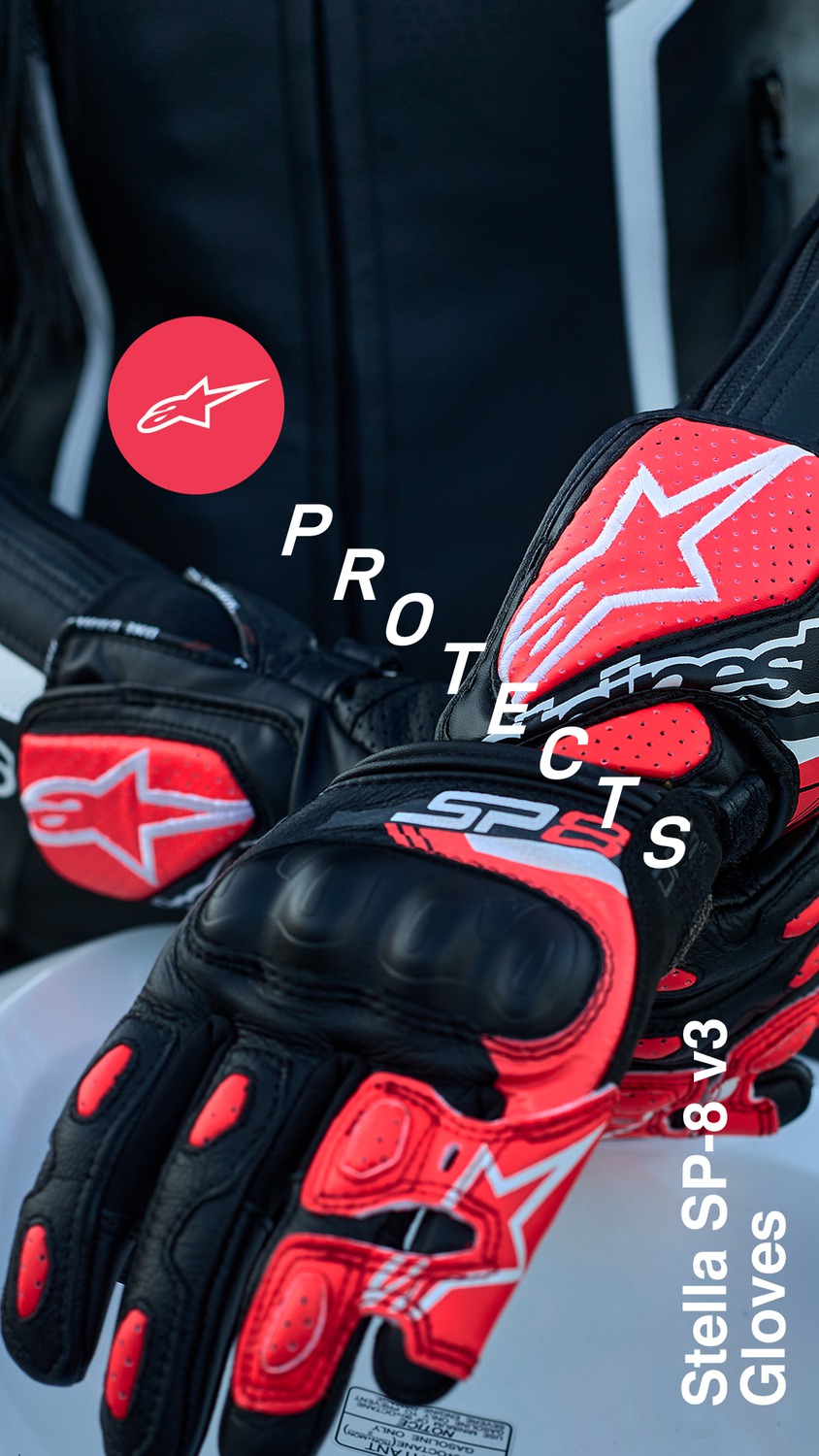 Rukavice SP-8 třetí generace jsou populární dlouhé sportovní rukavice, nesoucí závodní DNA značky ALPINESTARS. Obšívka rukavice je vyrobena z kozí kůže v kombinaci se syntetickým mikrovláknem. Zahrnuje vícepanelové uspořádání s integrovanými protektory pro dosažení vysokého standardu ochrany proti oděru a komfortu současně. Chránič zápěstí tvoří protektor z TPU plastu. Zapínání pomocí zdvojené manžety na suchý zip a strečový můstek mezi palcem a ukazováčkem zajišťují zvýšený komfort. Střihová varianta z dámské kolekce STELLA.