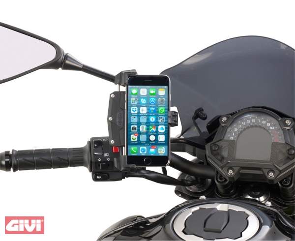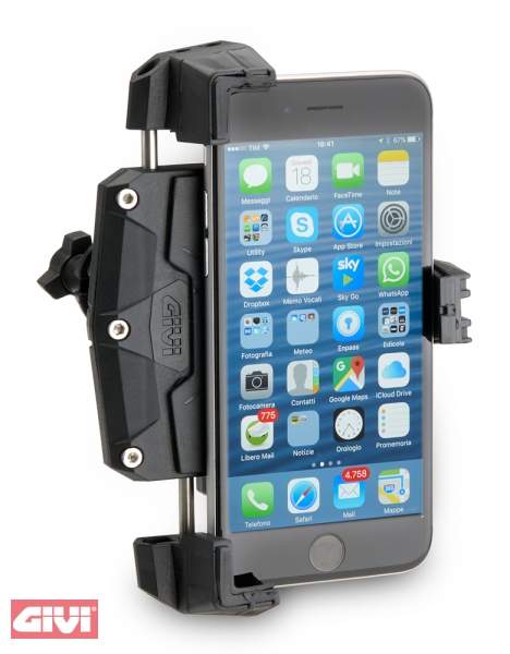 Univerzální držák smartphonu, umístitelný na motocykl, skútr, ctyrkolku, kolo. Nastavitelná velikost pro telefony s rozmery v rozsahu 112x52 až 148x75 mm.