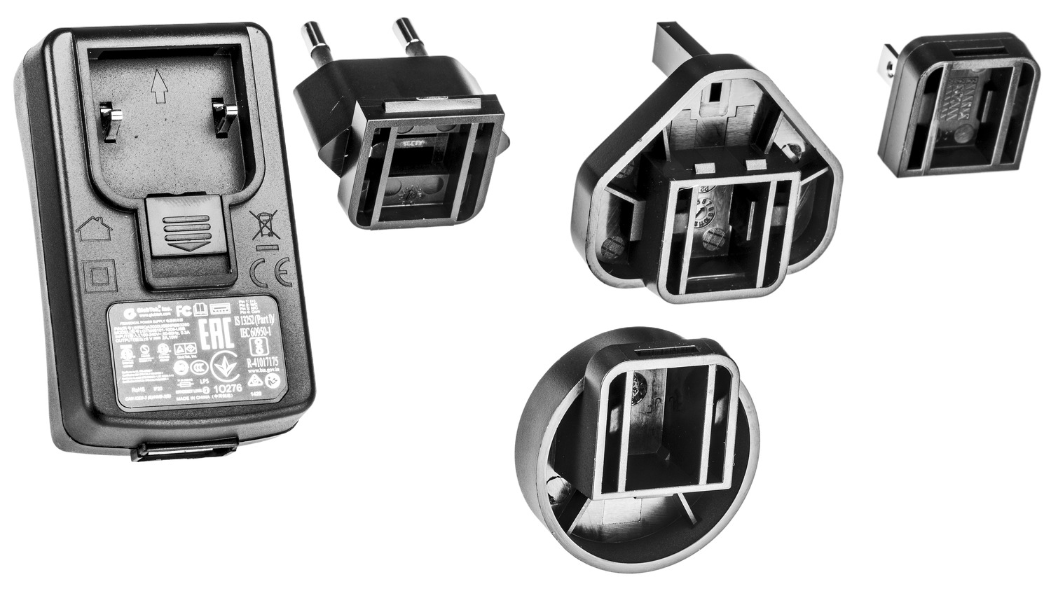 Sada s trafem a šesti adaptéry pro různé typy napěťové soustavy zásuvek elektrického vedení.