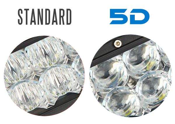 LED světla s 5D technologií jsou v současnosti nejpopulárnější mezi fanoušky offroadu. 5D LED světelné rampy nabízejí daleko lepší osvětlení, protože poskytují jak rozptýlený, tak i bodový paprsek světla. 5D LED rampy využívají kombinaci standardních LED modulů a speciálních LED modulů s čočkami typu "rybí oko", které zesilují paprsek světla v extrémně širokém úhlu 150 stupňů a navíc bez slepých zón, a tím mají výrazně vyšší výkon oproti standardním LED rampám. 5D rampy tak světelný paprsek současně rozprostírají do šíře a zároveň jej zaostřují na místo před vámi, a tím dosahují mnohem přesnějšího a intenzivnějšího osvětlení v porovnání se standardními LED rampami.