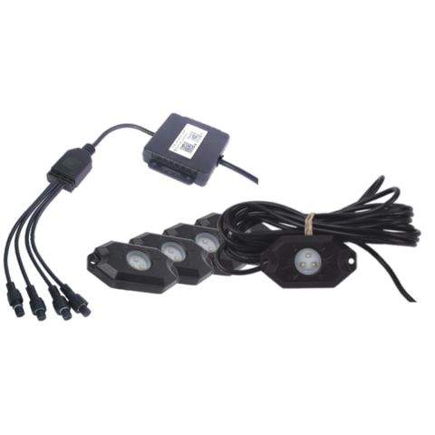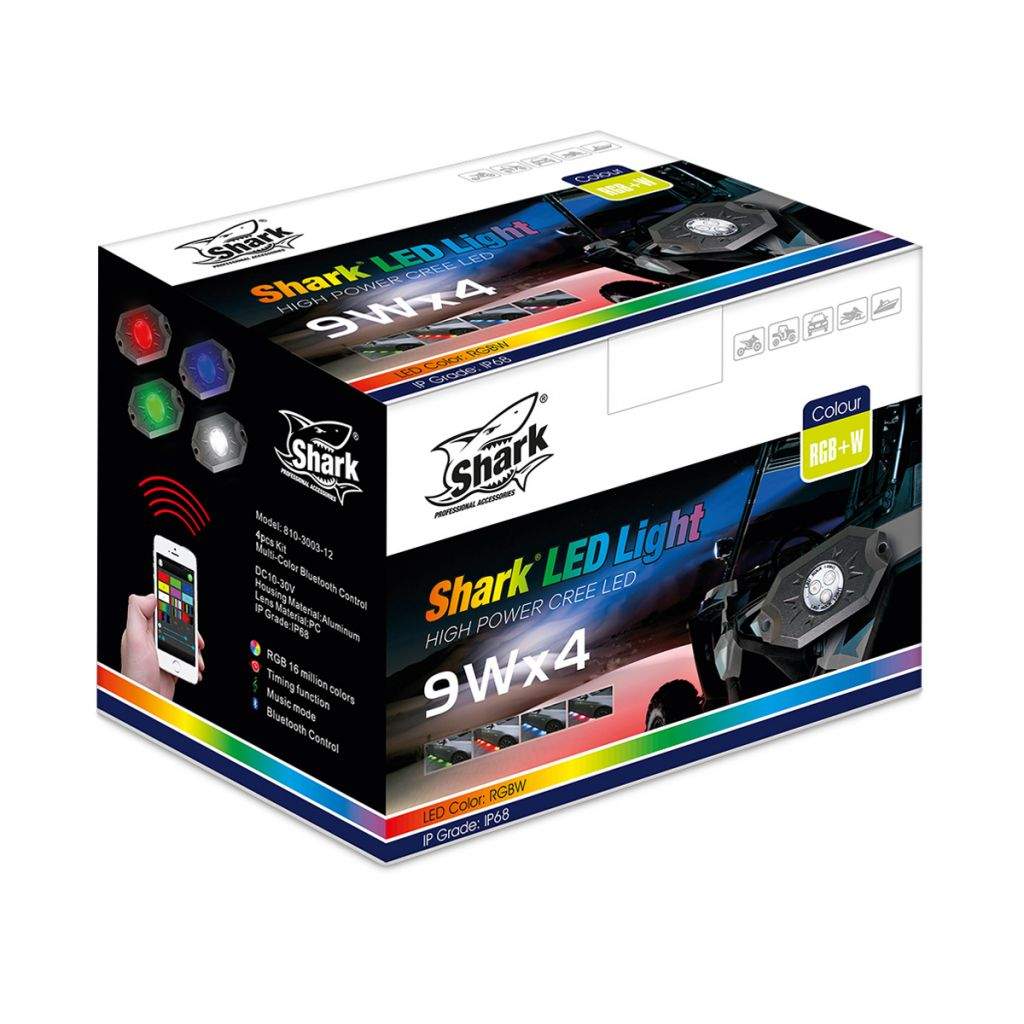 Jedinečné světelné efekty a atraktivní podsvětlení podvozku pro vaší čtyřkolku, UTV, offroad, automobil nebo motocykl. Super jasné LED (v každém světle svítí tři 3W LED čipy) s možností nastavení jedné ze 16 milionů barev pomocí dálkového ovládání přes Bluetooth. S pomocí mobilního telefonu si můžete nastavit různé světelné efekty a programy včetně hudebních. LED světla SHARK Rock Light jsou vodotěsná a odolná proti nárazům a vibracím. Na rozdíl od klasických neonových světel pro osvětlení podvozku jsou LED světla SHARK Rock Light odolná otřesům a mají vysokou životnost, v průměru přes 50.000 hodin. Světla lze navíc použít i pro osvětlení nástupního prostoru, osvětlení prostoru motoru, jako vnitřní osvětlení obytného vozu nebo přívěsu, světla pro denní svícení, couvací světla nebo světlo pro osvětlení nákladní korby. Sada se skládá ze 4 samostatných LED RGB světel, potřebné kabeláže a Bluetooth ovladače.
