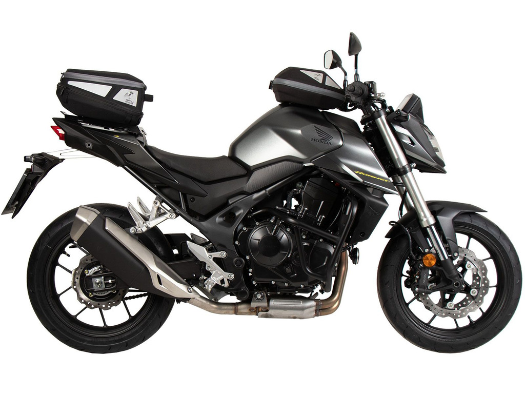 Sporttrack Black od Hepco&Becker nabízí perfektní řešení pro připevnění zavazadel pro super sportovce, jako je Honda CB 750 Hornet (2023-). Společnost Hepco&Becker vyvinula na míru šitou odpověď na známý problém zabezpečení zavazadel na těchto motocyklech. Sportrack je ukotven v původním držáku namísto sedadla spolujezdce a lze jej otevřít pomocí klíče zapalování vozidla. Tento inovativní design umožňuje rozsáhlé možnosti uchycení popruhů pro zajištění bezpečného připevnění různých zavazadel. Sestavení sportovního stojanu je jednoduché a nekomplikované. Vysoce kvalitní práškové lakování mu dodává nejen atraktivní vzhled, ale také zajišťuje odolnost vůči povětrnostním vlivům a dlouhou životnost. Sportovní nosič lze rychle vyjmout a řídí se stejným principem jako sedadlo spolujezdce. Díky rozsáhlým možnostem upevnění popruhů na zavazadla nabízí Sporttrack bezpečnou podporu pro různá zavazadla. Můžete jej rozšířit volitelným nástavcem pro bezpečné připevnění i velkých rolí zavazadel. Design sportovního nosiče připomíná potah sedadla a zároveň slouží jako další vizuální zvýraznění. Bezpečné uchycení zavazadel přímo za řidičem nijak neovlivňuje ovladatelnost stroje a zajišťuje nefalšovaný požitek z jízdy. Sporttrack Black je vhodný pro top case, ale pouze v kombinaci s pouzdry Journey Top Cases 30/40/50 v univerzální verzi s plastovou deskou. Upozorňujeme, že konvenční horní kufry Hepco&Becker s kovovým pojistným zámkem na základně horního kufru nejsou kompatibilní. Lze jej také kombinovat s ocasními vaky s uzávěrem Lock-it, jako je ocasní vak Royster Lock-it. Obecná provozní licence (ABE) nebo zápis v dokladech vozidla nejsou vyžadovány. Přiložený návod k instalaci usnadňuje instalaci. Užijte si neomezenou zábavu z jízdy a bezpečné upevnění zavazadel se Sportrack Black od Hepco&Becker na vaší Hondě CB 750 Hornet (2023-).