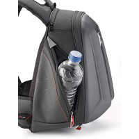 Batoh GIVI, polotuhé provedení thermoform, materiál EVA, UV odolný. Řada výrobků SPORT-T. 2 boční kapsy, každá na litrovou láhev, zadní panel z prodyšného materiálu, pásek na přilbu (nepoužívat za jízdy!), madlo, bederní a prsní nastavitelný popruh, 3 vnitřní kapsy včetně kapsy na 13" tablet, kapsa na sluneční brýle, integrovaná pláštěnka.