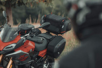Rackpack se doporučuje uchytit na horní nosič SW-Motech přes rozšíření plotny ADVENTURE-RACK, ale lze uchytit i na zadním sedle spolujezdce nebo na nosiči bez rozšíření plotny.