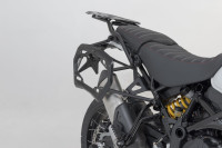 SW-MOTECH postavil stříbrný hliníkový systém kufrů vhodný pro Ducati DesertX pomocí extrémně odolných bočních nosičů PRO specifických pro kolo.