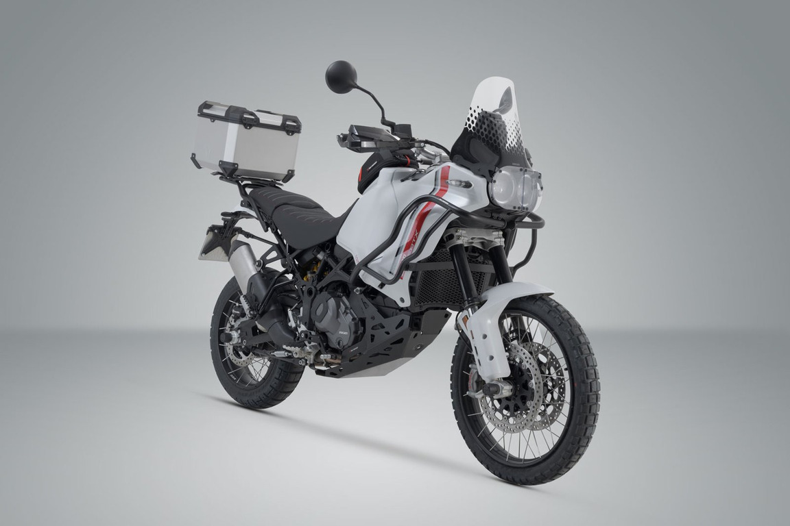 Systém horních kufrů TRAX ADV se skládá z robustního stříbrného horního kufru a sladěného nosiče ADVENTURE-RACK pro Ducati DesertX.