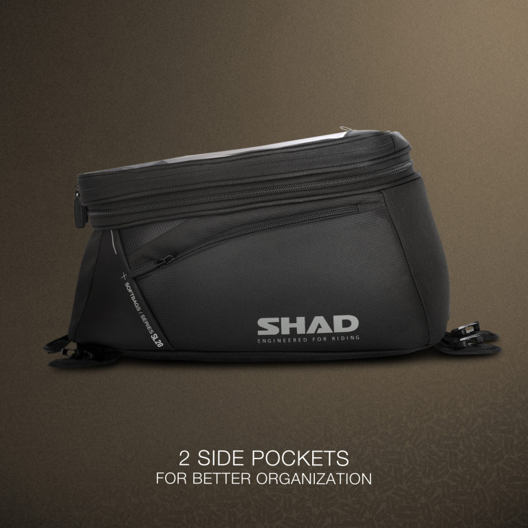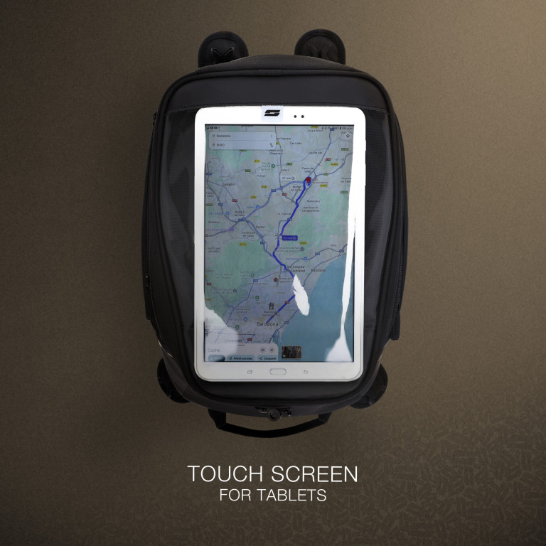 Horní přihrádka je určena pro mapy, tablety a GPS, s dotykovou fólií. Připevnění k motocyklu pomocí popruhů uchycených k rámu motocyklu a řídítkům (součást balení).