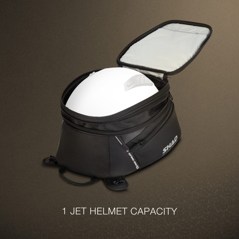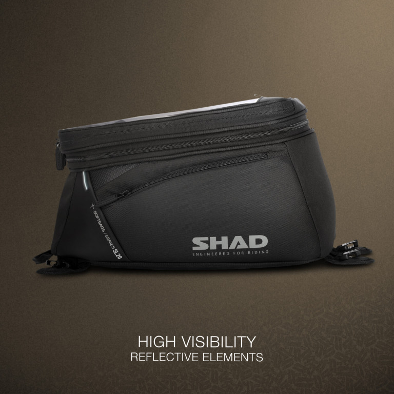 Rozšiřitelná tanková brašna s reflexními prvky pro zvýšení bezpečnosti.