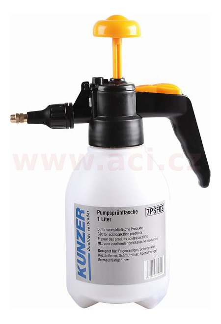 Pumpičková láhev o objemu 1 litr z materiálu HDPE s nastavitelnou mosaznou rozprašovací tryskou.