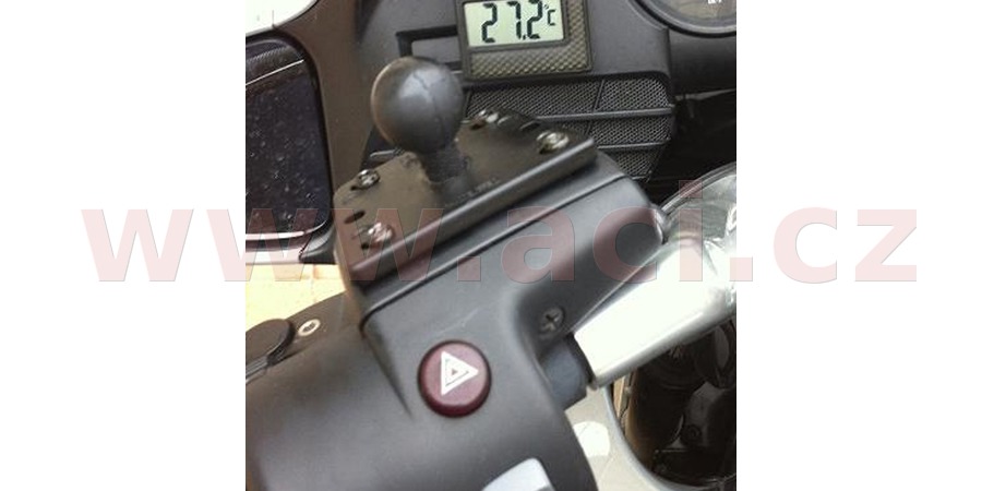 Úchyt na motorku na nádržku brzdové kapaliny na řídítkách s kulovým čepem ve středu. Úchyt se připevňuje přes víčko nádržky. Patentovaný kulový čep je vyroben z velmi kvalitní pryže tak, aby tlumil nárazy a vibrace, které by jinak byly přenášeny na upevněné elektronické zařízení. V balení naleznete potřebné šrouby a podložky a instalace je jednoduchá, viz návod.