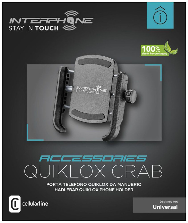 Univerzální držák Interphone Crab vám umožní mít váš mobilní telefon pohodlně a bezpečně po ruce během jízdy na motocyklu. Spojuje v sobě výhody tvrzené hliníkové konstrukce, stylového designu a praktického provedení. Držák je vybaven rychloupínacím "Spider" systémem uchycení telefonu. Kleště držáku jsou kryté silikonovým polstrováním a bezpečně zafixují jakýkoliv mobilní telefon s šířkou 6 - 9 cm, který se nepohne ani při sebevětších otřesech způsobených jízdou. Držák je určen pro použití s novým rychloupínacím systémem QUIKLOX, pro jeho pevné zajištění stačí pouhé pootočení. Stejně rychle pak telefon po skončení jízdy odepnete.