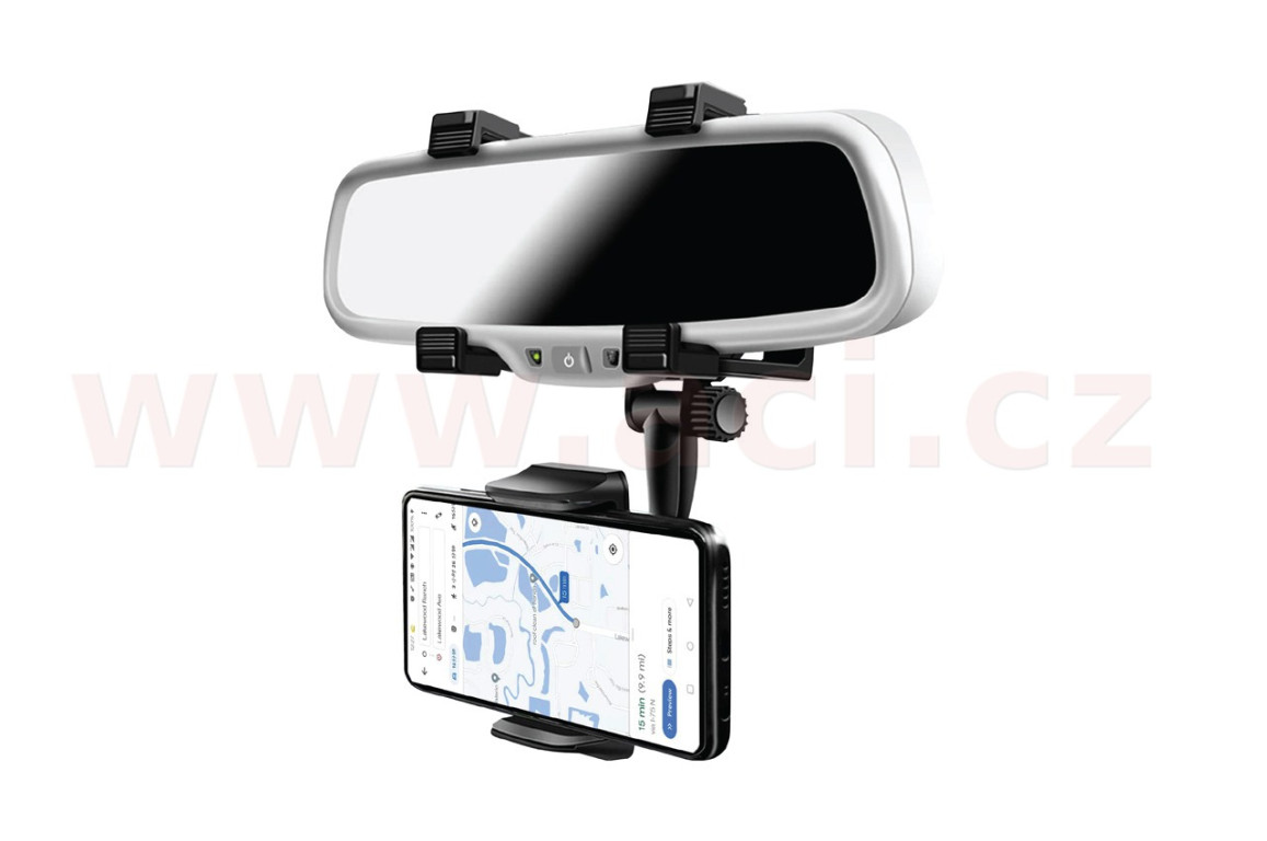 Držák se montuje pod zpětné zrcátko v automobilu, což umožňuje používat telefon během jízdy, aniž by byla ohrožena bezpečnost.