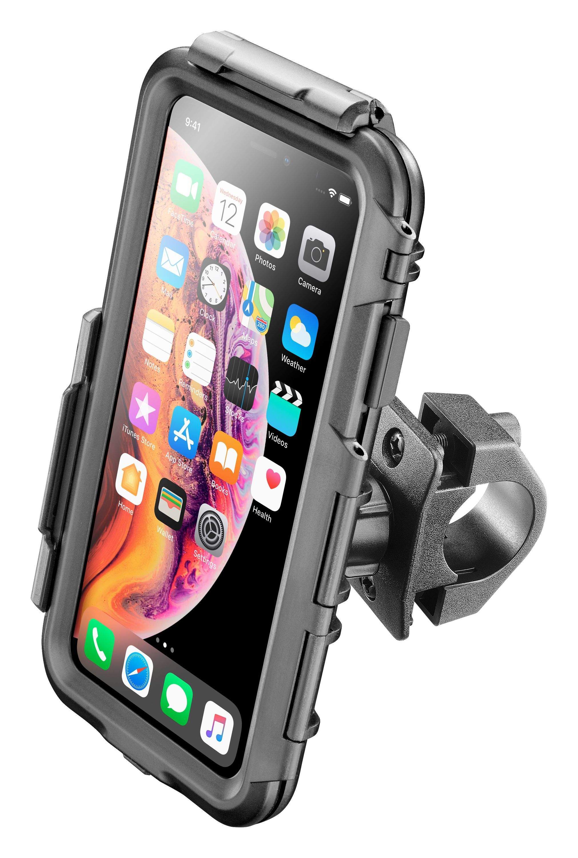 Pouzdro CellularLine Interphone pro motocykl nebo kolo je určeno do extrémních situací, kde dokonale ochrání váš telefon. Pouzdro je voděodolné se stupněm krytí IPX4 a je plně přizpůsobené pro rozměry Apple iPhone XS Max. Vrchní strana vyrobená z elastického průhledného materiálu chrání displej přístroje před poškozením, či vodou. Speciální úprava zajišťuje pohodlné ovládání přístroje, zároveň je přizpůsobena i pro ovládání dotykového displeje iPhonu. Sada obsahuje držák na řídítka o průměru 16 - 30mm. Ideální společník pro jízdu na kole i na motorce.