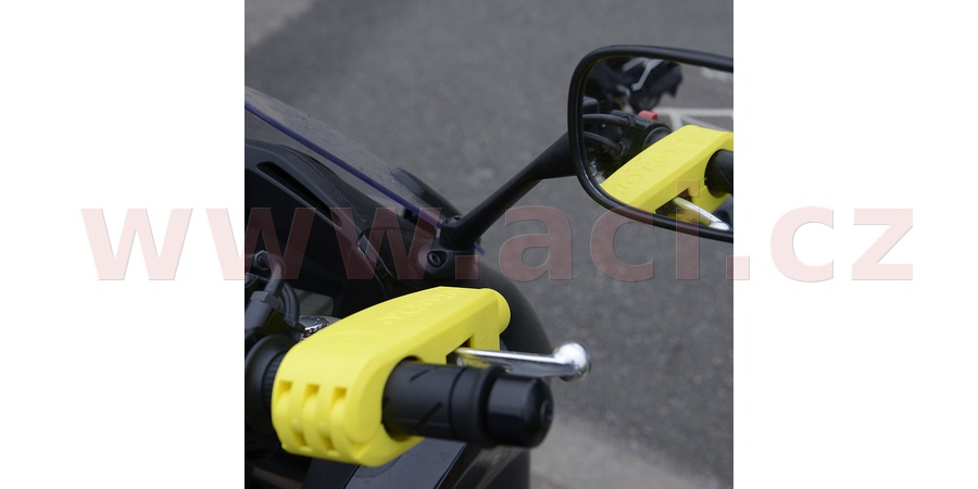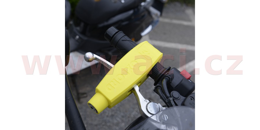 Viditelný zabezpečovací prvek určený pro fixaci brzdové páčky motocyklů, skútrů a čtyřkolek.